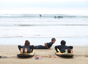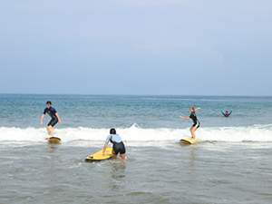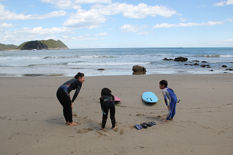 砂浜で準備体操やサーフィンの基本動作のレクチャーをしてから、海に入ります。
